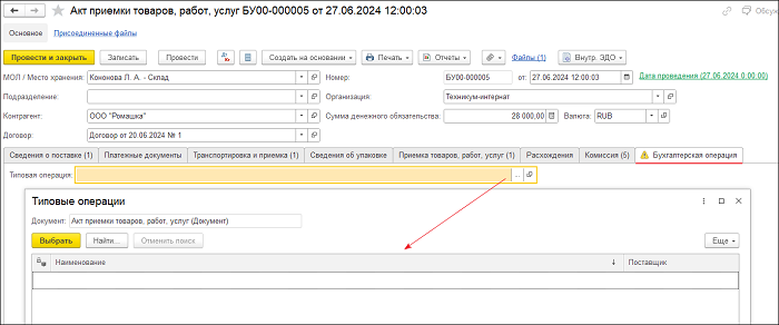10. На закладке «Бухгалтерская операция» (рисунок 9) нет возможности выбрать типовую операцию и скорректировать отложенные обязательства, т. к. вид поставки имеет значение «Прочая». Поставка и приемка товара согласно условиям примера, проводятся в один день, поэтому документ «Акт приемки товаров, работ, услуг» не должен формировать бухгалтерских записей.