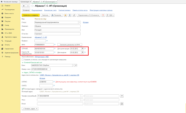 Заполнение ОГРНИП и даты его присвоения также реализовано в 1С. Если эти данные указаны в карточке организации, то программа заполнит их автоматически. Проверить заполнение можно в разделе «Главное» – «Организации» – открыть карточку ИП.