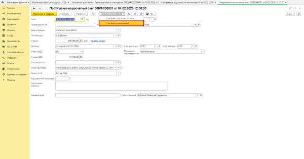 - Вручную. Данный способ подходит для точечного выставления счетов-фактур. Для этого достаточно из документа «Поступление на расчетный счет» выполнить команду «Создать на основании»