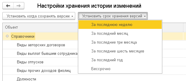 По кнопке Установить срок хранения версий настраивается правило длительности хранения версий объектов.