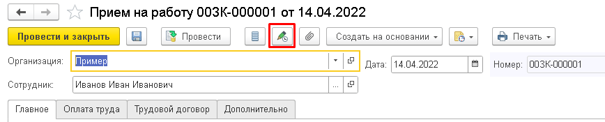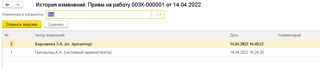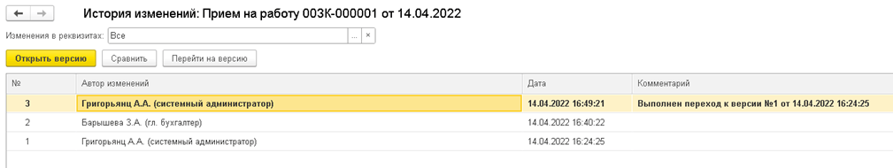 В результате произведенных настроек в объектах конфигурации будет сохраняться история изменений. Историю можно просмотреть в самих объектах (справочниках и документах) по кнопке Перейти к истории изменений в шапке документа. Например, рассмотрим документ Прием на работу.