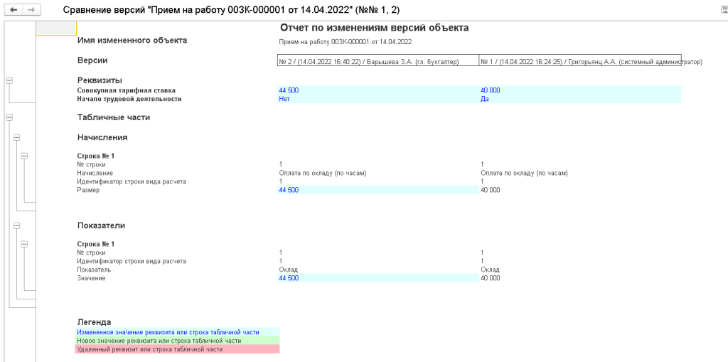 При открытии версии мы увидим какие данные в этой версии занесены. А если выделить две строчки и нажать кнопку Сравнить, то увидим, какие данные были изменены.