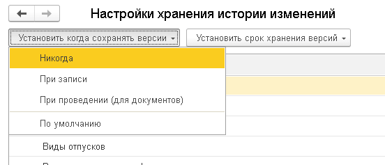 С помощью кнопки Установить когда сохранять версии можно установить, когда сохранять версию, какому конкретному объекту или списку объектов.
