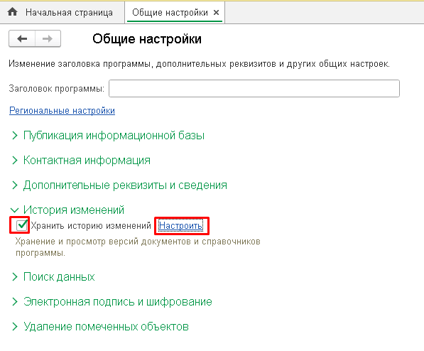 Для включения возможности хранения необходимо перейти в раздел Администрирование - Общие настройки - Истории изменений, установить флажок Хранить историю изменений. Для настройки истории хранения версий необходимо перейти по гиперссылке Настроить.