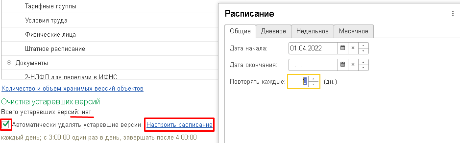 Для того, чтобы устаревшие версии удалялись автоматически, необходимо включить соответствующий флаг и перейти по гиперссылке Настроить расписание. Настроенное расписание будет выводиться в нижней части окна.