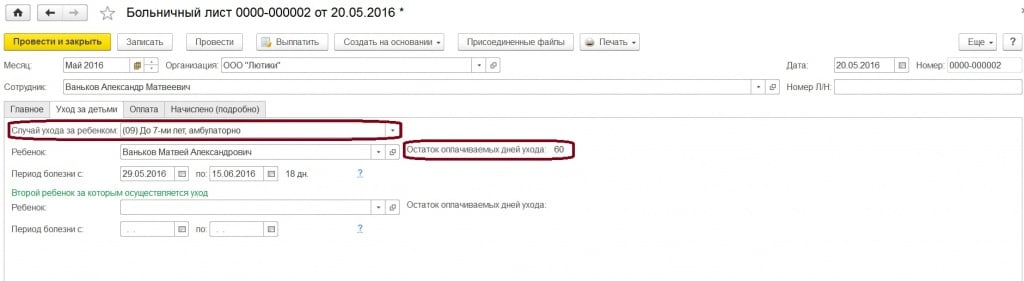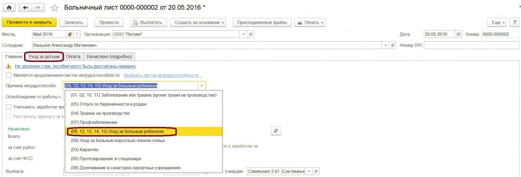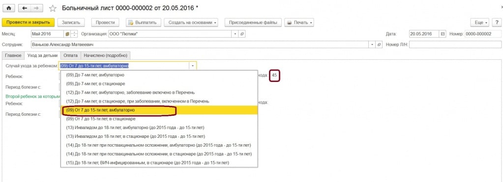 Именно на этой вкладке конкретизируется случай ухода за ребенком от которого зависит количество оплачиваемых дней.