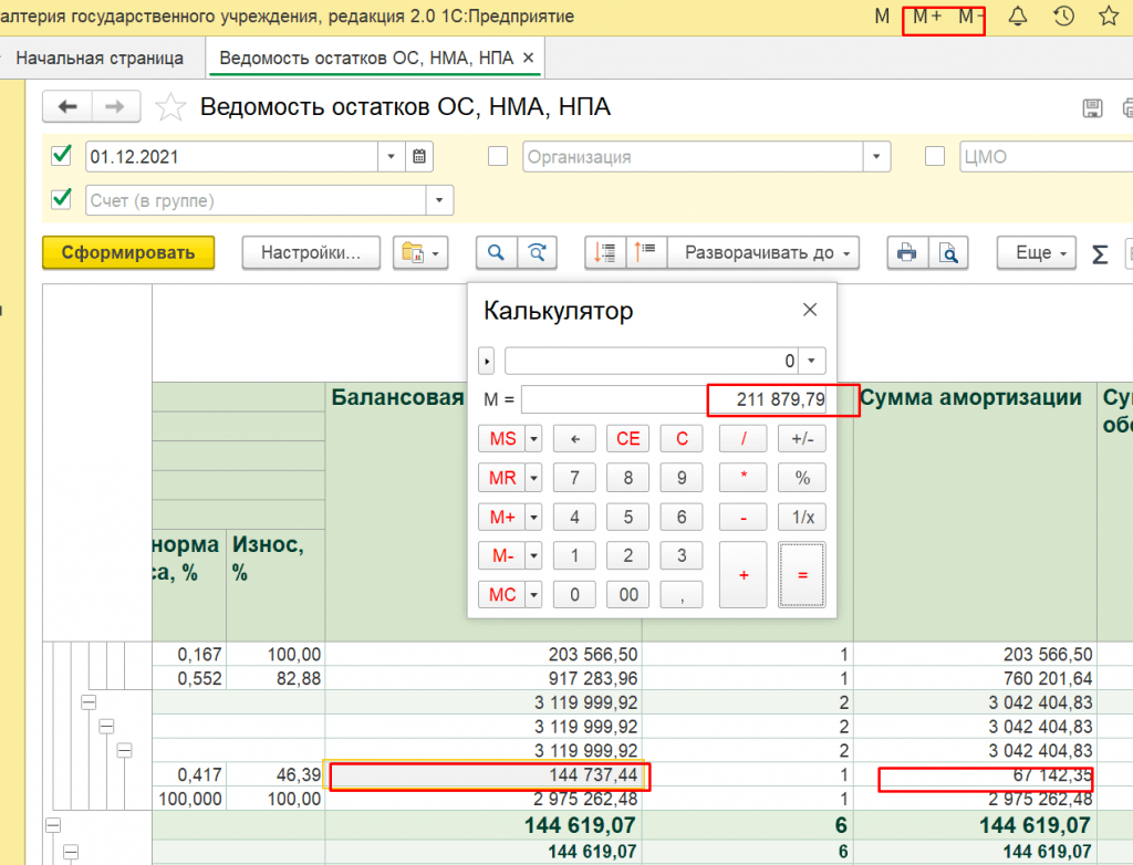 Открываем калькулятор, нажимаем последовательно на нужную цифру и клавишу М+ либо М- вверху экрана, (в зависимости от того, нужно сложить или вычесть), опять на цифру и клавишу вверху экрана. Таким образом, в таблице 1С можно быстро производить арифметические действия.