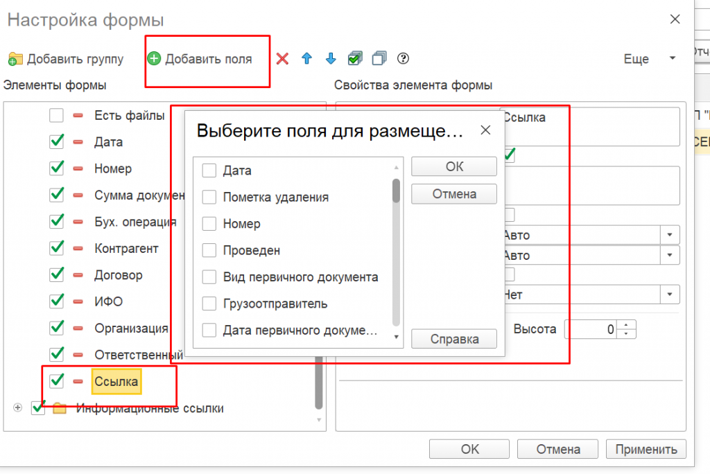 Если хотим добавить еще поля, необходимо найти поле с названием Ссылка или Владелец, тогда станет активной кнопка Добавить. Нажав ее, мы можем выбрать из большого списка реквизитов необходимые именно нам.