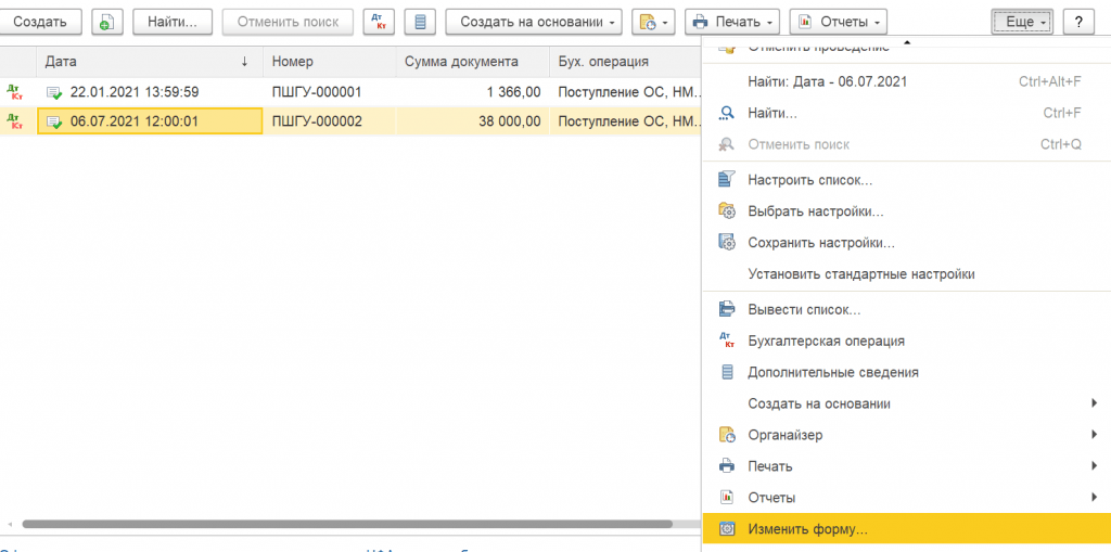 2. Настраиваем список. Часто в списке документов нам не хватает некоторых колонок, которые необходимы в работе. Через меню Изменить форму можно достать только то, что предусмотрели разработчики.
