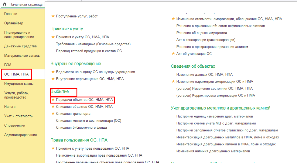 Как правило, государственные учреждения лишены права самостоятельного распоряжения основными средствами, находящимися в их оперативном управлении. Объекты представляют собой государственную (муниципальную) собственность. Разберем на примере Музыкального центра безвозмездную передачу основного средства от одного бюджетного учреждения другому в порядке межбюджетной передачи. Для этого перейдем в меню ОС, НМА, НПА – Выбытие - Передачи объектов ОС, НМА, НПА.