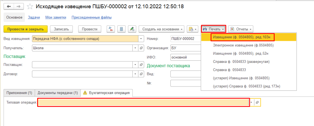 Далее нажимаем Заполнить по документам передачи. Обращаем внимание, что на закладке Бухгалтерская операция поле Типовая операция не заполняется, и, соответственно, не формируются проводки. Данный документ можно распечатать либо выгрузить в файл.