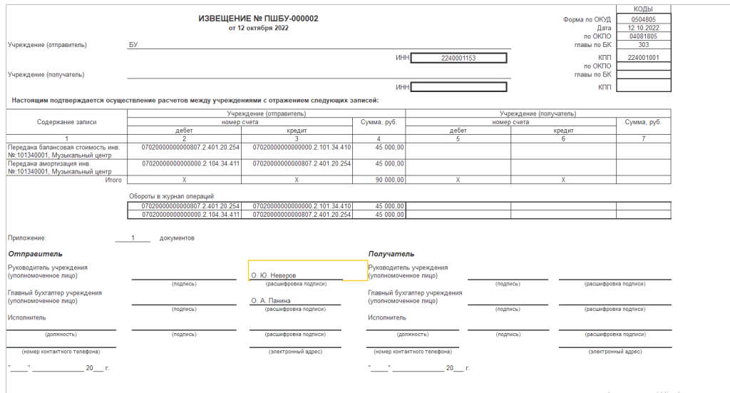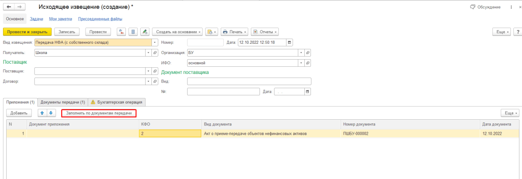 При необходимости можно сформировать Исходящее извещение, которое находится в меню Учет и отчетность – Расчеты - Внутриведомственные, межведомственные, межбюджетные расчеты. Но удобнее создать Исходящее извещение непосредственно из документа Передача объектов ОС, НМА, НПА через пункт меню Создать на основании.