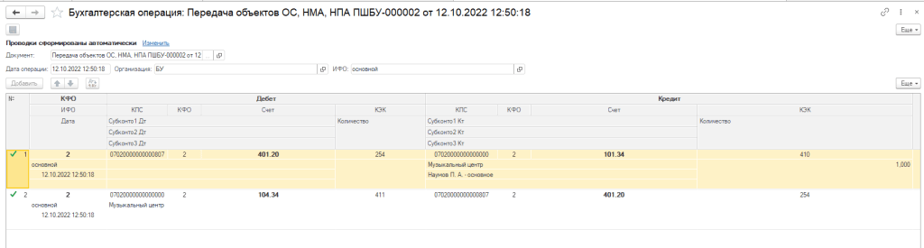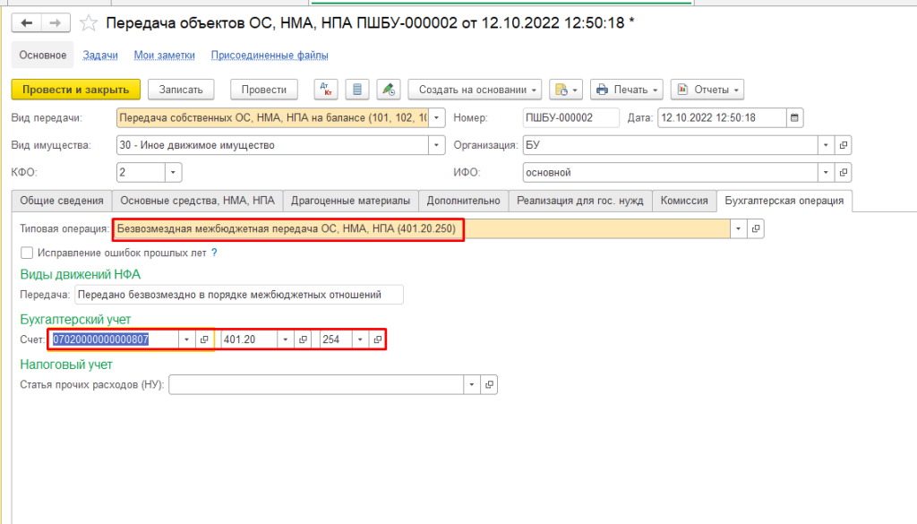 Во вкладке Бухгалтерская операция выбираем в поле Типовая операция Безвозмездная межбюджетная передача ОС, НМА, НПА (401.20.250). Поле Бухгалтерский учет заполняем КПС и КЭК.