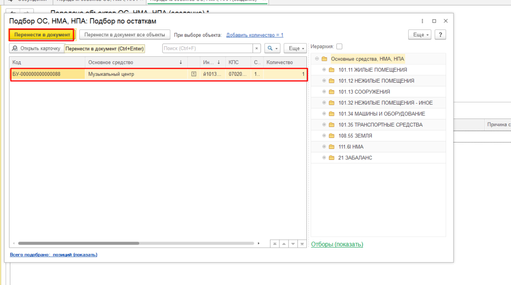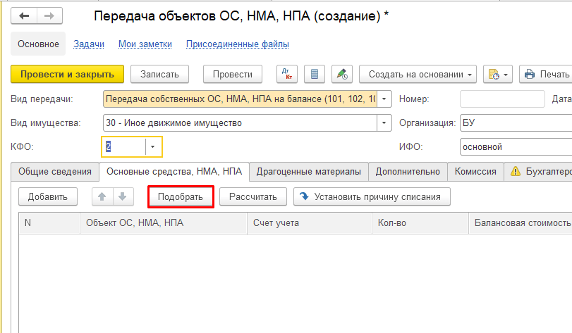 Теперь перейдем во вкладку Основные средства, НМА, НПА и с помощью кнопки Подобрать переносим нужное основное средство в документ.