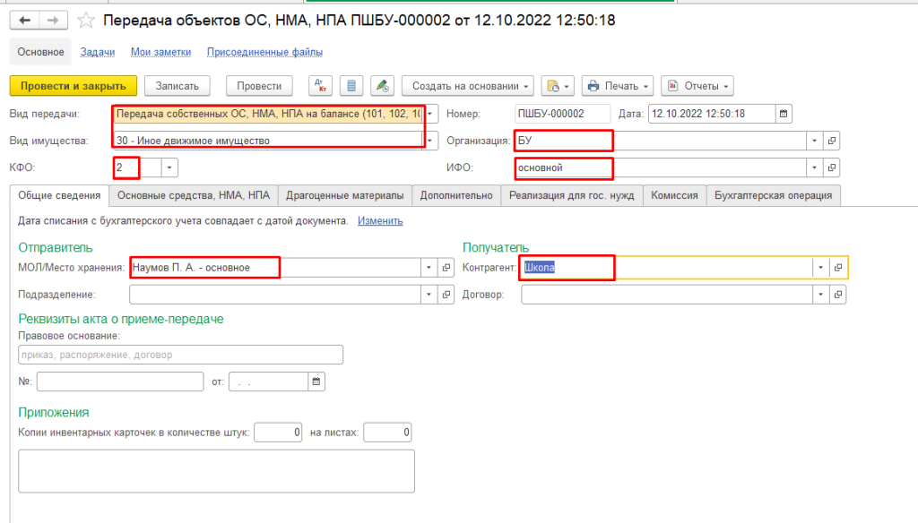 Создаем новый документ, Вид передачи выбираем Передача собственных ОС, НМА, НПА на балансе (101, 102, 103, 111.60), Вид имущества - 30 - Иное движимое имущество, остальные поля закладки Общие сведения заполняем как обычно.