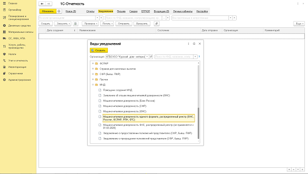 Для создания такой МЧД перейдите в раздел «Уведомления» — «Создать» — «МЧД — Машиночитаемая доверенность единого формата, распределенный реестр (ФНС, Росстат, РПН, ФТС)».