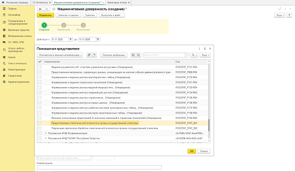 Заполните форму. Для этого в полномочиях выберите «Предоставление статистической отчетности в органы государственной статистики».