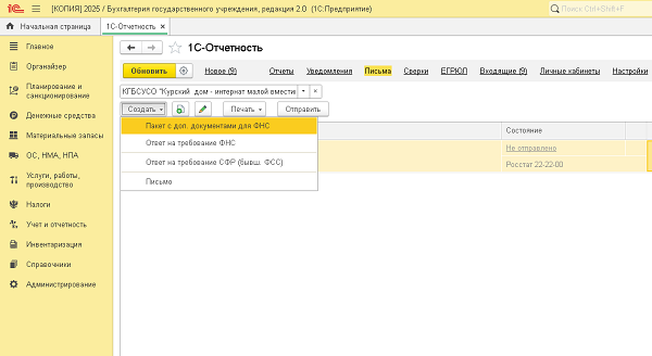 Теперь, если объем всех приложенных файлов превышает 1МБ, но файлы по отдельности весят меньше 1 МБ, сервис предложит разбить отправку на несколько писем. Если вложение больше 1МБ, программа предложит создать пакет с дополнительными документами («Пакет с доп. документами для ФНС» из выпадающего списка).