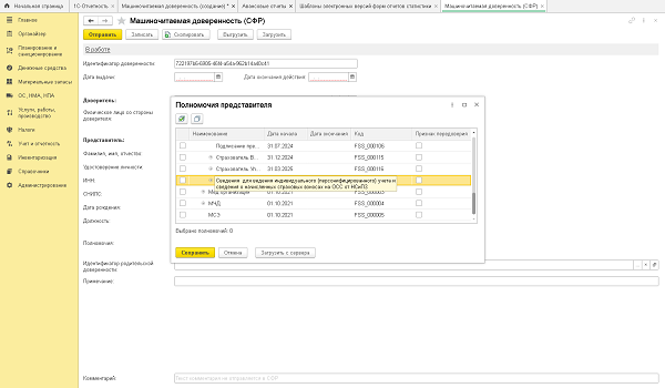 Чтобы создать такую МЧД, перейдите в раздел «Уведомления» - «Создать» - «МЧД» - «Машиночитаемая доверенность (СФР)». Заполните данные в поле “Полномочия”. Укажите «Сведения для ведения индивидуального (персонифицированного) учета и сведения о начисленных страховых взносах на ОСС от НСиПЗ».