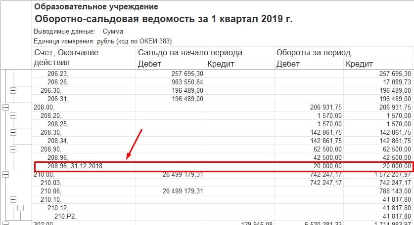 В оборотно-сальдовой ведомости, видим устаревший счет 208.96, окончание действия которого 31.12.2018.