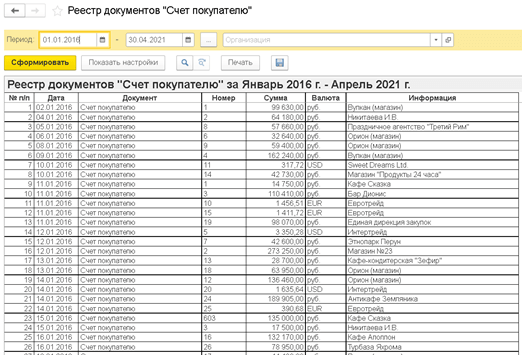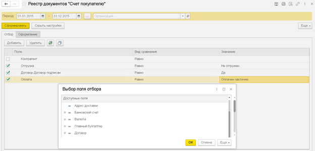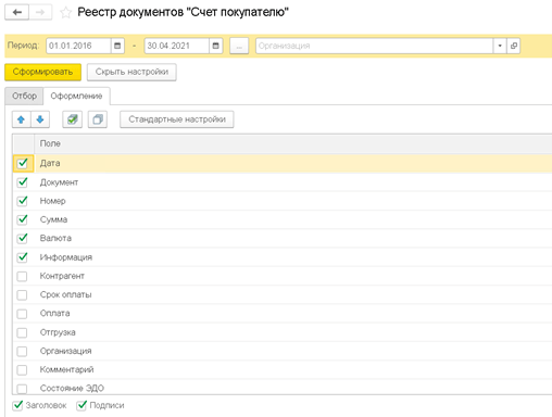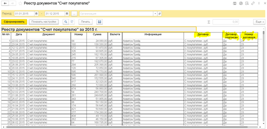 Зачастую при формировании реестра документов пользователю нужно отразить дополнительные поля, например договор, номер договора и статус его подписания. Рассмотрим, как добавить данные поля на примере реестра документов «Счет покупателю».