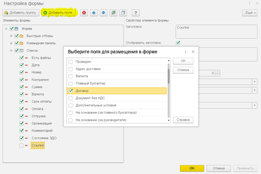 Выделяем «Ссылку» в разделе «Список», нажимаем «Добавить поля» и добавляем договор.