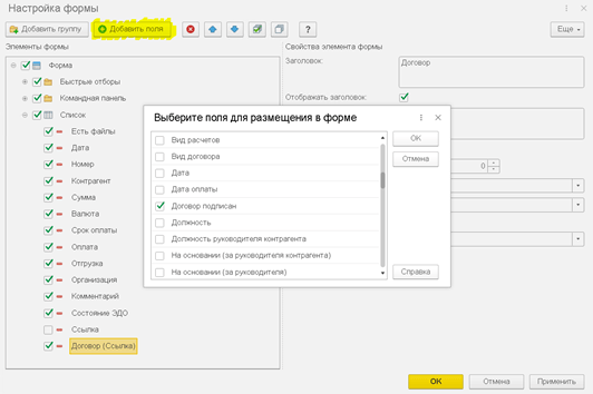 Появилось поле «Договор (ссылка)». Выделим его и добавим поля с номером договора и статусом подписания. После сохранения изменений добавленные поля отразятся в форме списка документов.