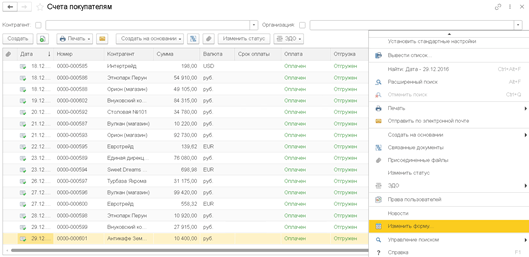 Для их добавления нужно изменить саму форму списка «Счета покупателям». По кнопке «Еще» находим «Изменить форму».