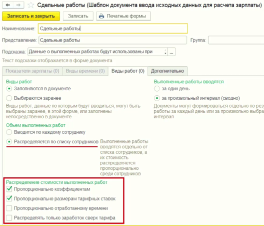 Регистрация самой сдельной выработки производится документом Сдельные работы (раздел Зарплата/Данные для расчета зарплаты). Документ появляется благодаря тому, что создается типовой шаблон ввода документа, который можно посмотреть в разделе Настройка – Шаблон ввода исходных данных, и типовой шаблон, который создается, когда мы включаем настройках «Сдельные работы». Данные распределяются по списку сотрудников с задаваемыми значениями стоимости выполненных работ.