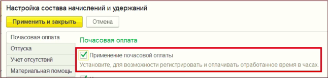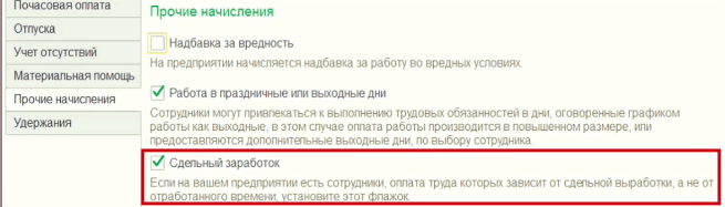 Для возможности активации работы со сдельным заработком необходимо в настройках программы Расчет зарплаты – Настройка состава начислений и удержаний пометить флажками раздел «Применение почасовой оплаты», в котором, как правило, используется сдельный заработок для работающих по часовому тарифу. Кроме того, требуется на закладке «Прочие начисления» отметить галочкой раздел «Сдельный заработок».