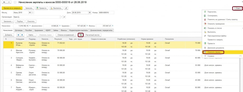 Так вот программа позволяет легко настраивать табличные части документа под потребности пользователя. Если вы столкнулись с подобной ситуацией, то попробуйте такую настройку: по кнопке «Еще» в правом верхнем углу выберите «Изменить форму»:
