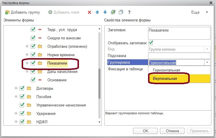 В левой колонке выбираем элемент формы «Показатели», потом в правой - вертикальную группировку. Что это даст? Все показатели для расчета начислений, которые были растянуты по табличной части, компактно сгруппируются построчно.