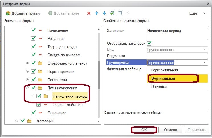 Также можно сгруппировать и период, для этого раскрываем «Даты Начисления» и выделяем «Начисления период» в левой области, а в правой напротив группировки выбираем из списка позицию «Вертикальная»: