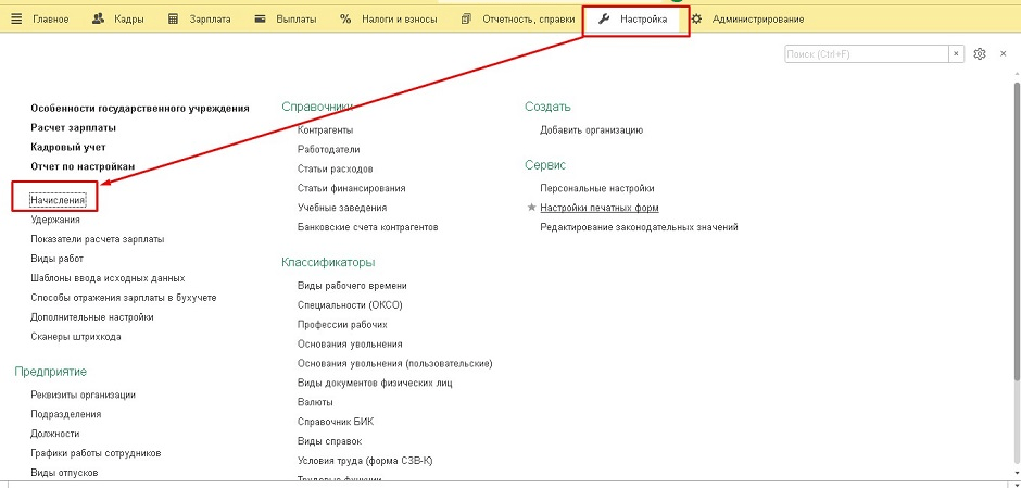 1. Сделаем настройку в свойствах начислений и выберем нужный код. Для это переходим в раздел «Настройки» - «Начисления».