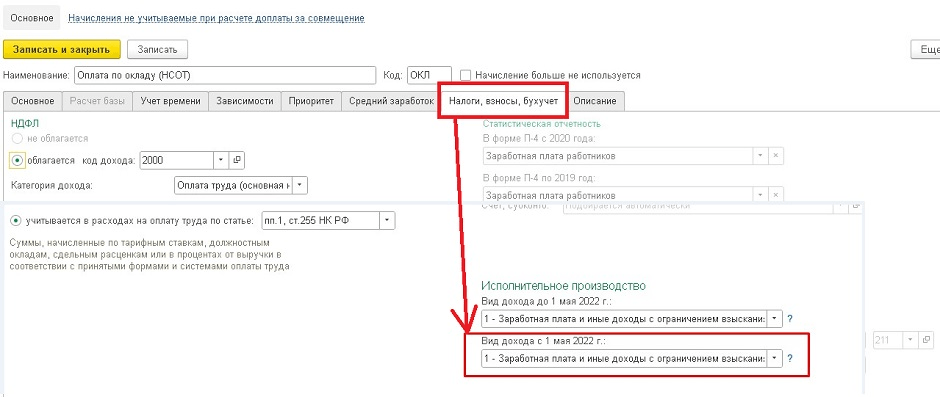 2. Далее выбираем нужное нам начисление. В начислении переходим во вкладку «Налоги, взносы, бухучет» - «Исполнительное производство» и заполняем «Вид дохода с 1 мая 2022 г.». Далее нажимаем «Записать и закрыть».