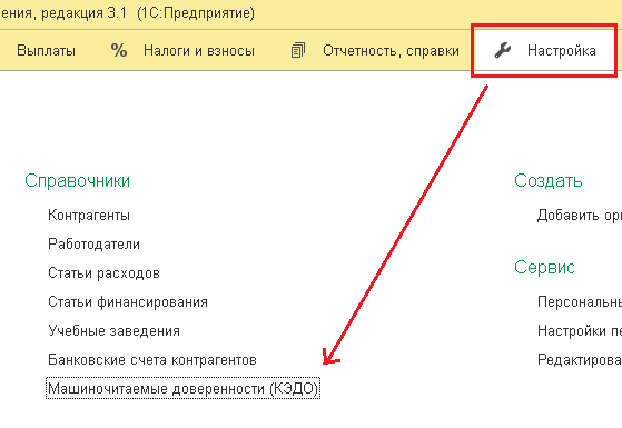 Создать МЧД можно в 1С:ЗУП. Выберите раздел «Настройки» и нажмите на «Машиночитаемые доверенности (КЭДО)». МЧД подписывается и отправляется только подписью руководителя.