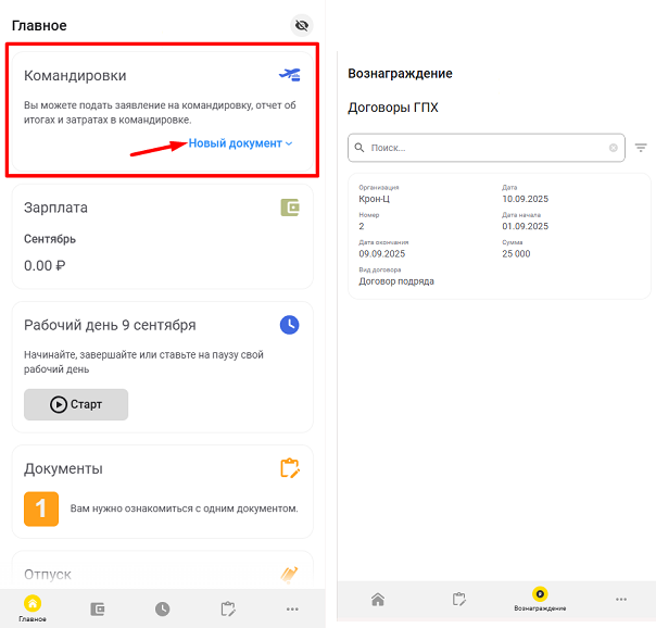 - Добавлен раздел «Командировки» для подачи заявок и отчетов с интеграцией сервиса Smartway для бронирования билетов.