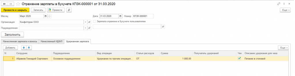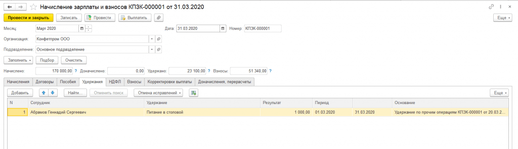 Далее, как обычно, формируем документ «Начисление зарплаты и взносов», проверяя на закладке «Удержания», что у нужного нам сотрудника появилось удержание.