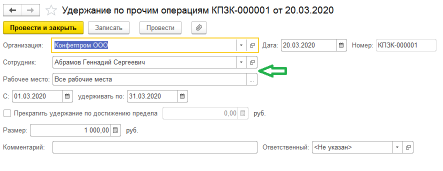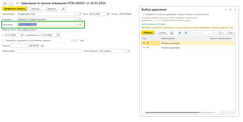 Теперь можно оформлять удержание документом «Удержание по прочим операциям». Выбираем сотрудника, заполняем период и сумму удержания. Обратите внимание, если в списке удержаний введено только одно удержание в счет расчетов по прочим операциям, то при вводе документа строка «Удержание» будет недоступна.