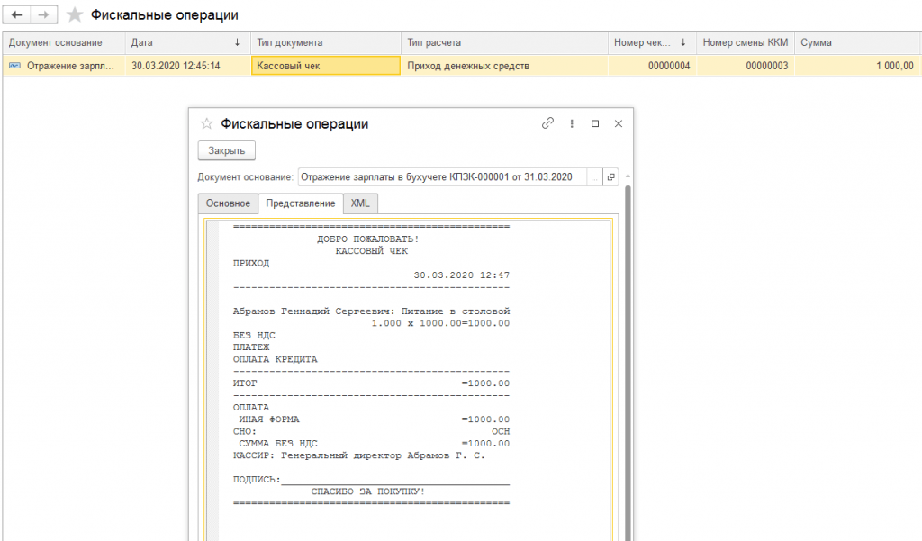 В соответствии с Федеральным законом от 22.05.2003 № 54-ФЗ с 1 июля 2019 каждому работодателю необходимо оформлять кассовый чек сотруднику, когда он продает товары, оказывает услуги, например, организует питание в обеденный перерыв в собственной столовой. В качестве исключения чек оформлять не нужно, если удержание стоимости переданных сотруднику в качестве оплаты труда товаров (работ, услуг) предусмотрено коллективным или трудовым договором. Полный перечень исключений вы можете посмотреть на сайте ИТС https://its.1c.ru/db/kkt#content:156:1, а мы с вами рассмотрим пошаговый пример, в случае, когда чек отбивать обязательно.