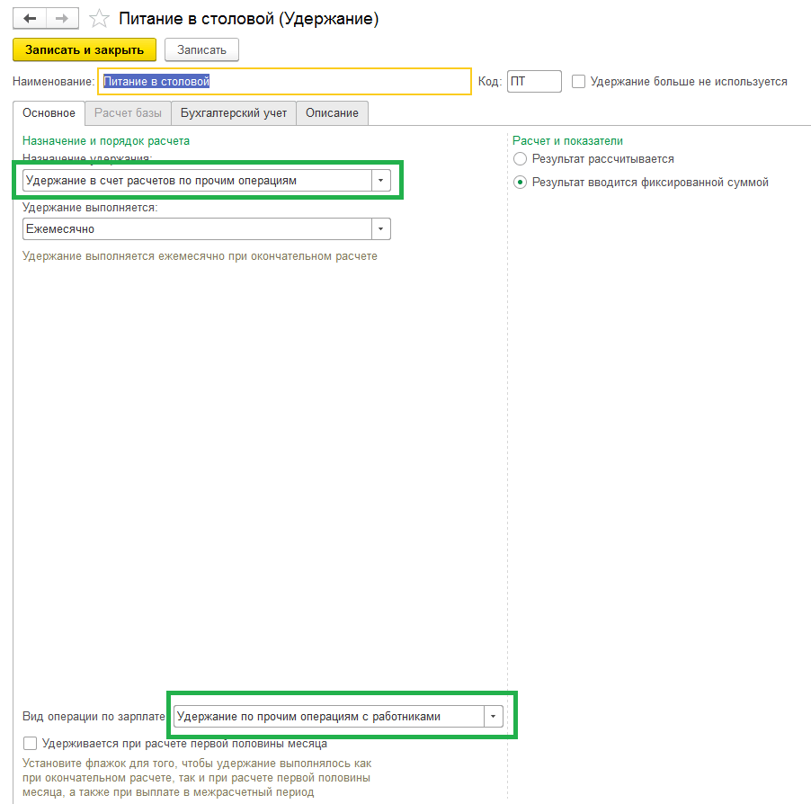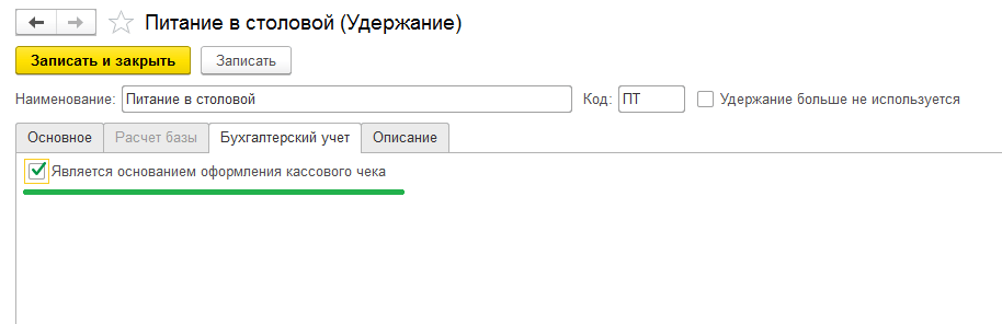 Настраиваем назначение удержания, выбираем из выпадающего списка «Удержание в счет расчетов по прочим операциям», вид операции «Удержание по прочим операциям с работниками». На закладке «Бухгалтерский учет» нужно установить флажок «Является основанием оформления кассового чека».