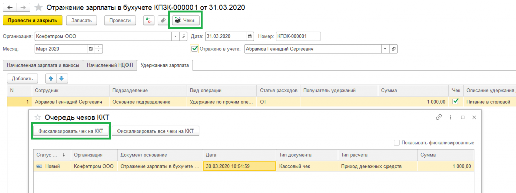 Чеки формируются только в «Бухгалтерии предприятия», но перед этим необходимо провести настройки в «Зарплата и управление персоналом»: