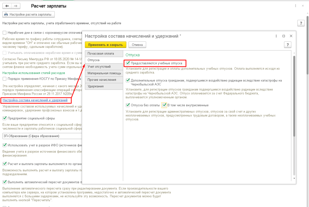 Для оформления оплачиваемого учебного отпуска в программе в настройках расчета зарплаты поставьте галочку Предоставляется учебный отпуск (раздел Настройка - Расчет зарплаты - Настройка состава начислений и удержаний –-вкладка Отпуска).