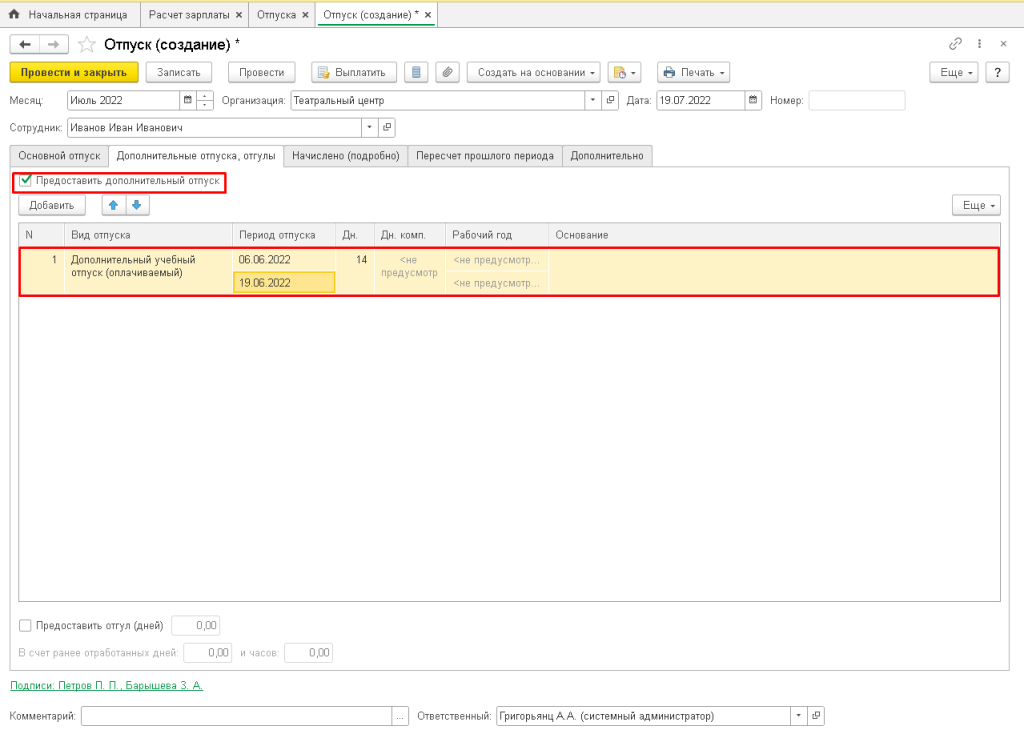 После настроек в справочнике видов отпусков будет создан вид отпуска Дополнительный учебный отпуск (оплачиваемый), а в справочнике начислений - вид расчета Дополнительный учебный отпуск (оплачиваемый). Они и будут использоваться для оформления отпуска.