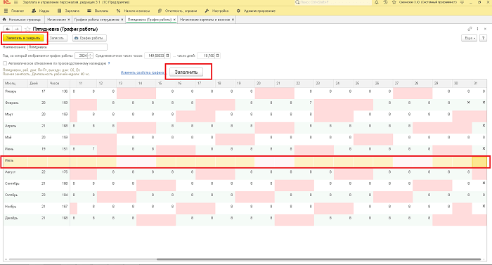 Как правило, ошибка возникает в начале года. Первое, что необходимо проверить, это графики работы сотрудников (Настройка — Предприятие — Графики работы сотрудников). В открывшемся окне перед начислением зарплаты обязательно проверьте, заполнены ли графики на текущий год или месяц. В нашем примере за июль нет графика, следовательно, для ее исправления нам нужно его заполнить, записать и закрыть.