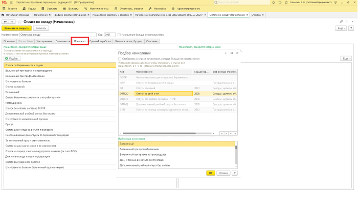В нашем примере ошибка сигнализирует о том, что при начислении зарплаты не учитывается отпуск за свой счет. Для исправления ошибки перейдем в раздел «Настройка» — «Начисления» — «Оплата по окладу» — вкладка «Приоритет» — «Подбор» — 2 раза щелкнуть по начислению, которое нужно добавить — «ОК».