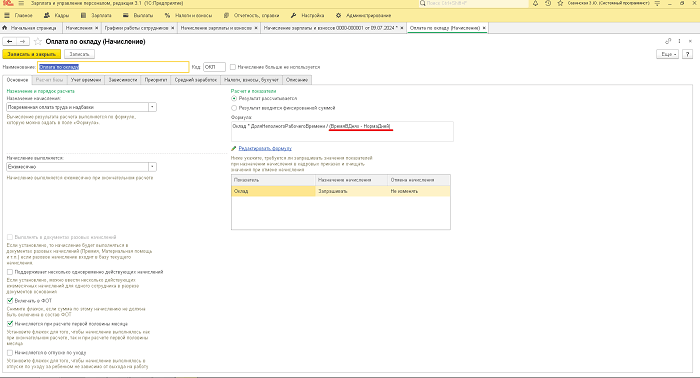 Ошибка деления на ноль может возникать и в случае, когда неправильно настроено начисление. Если при расчете заработной платы у вас вышла такая ошибка, но график заполнен корректно, следующее, что нужно проверить это само начисление («Настройка» — «Начисления»). В приведенном примере это «оплата по окладу».
