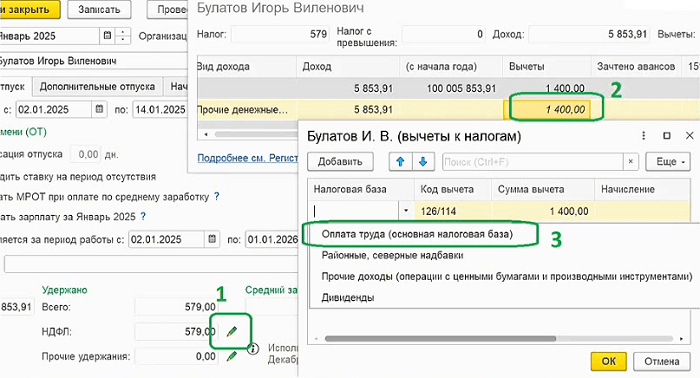 В связи с изменениями 2025 года весь доход разделен на следующие виды налоговых баз: оплата труда, районные, северные надбавки, прочие доходы и дивиденды. В связи с чем был добавлен реквизит «Вид налоговой базы» в два регистра накопления, связанных с вычетами: стандартные социальные вычеты и имущественные вычеты.