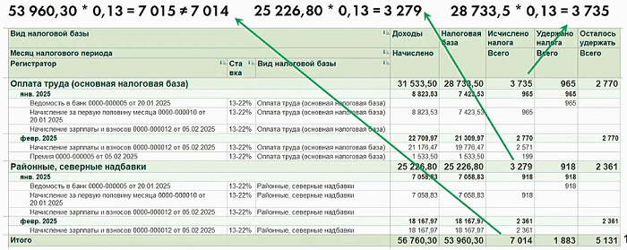Это связано с новой методикой расчета НДФЛ. По сотруднику доход разбивается на две налоговые базы и НДФЛ с дохода считается отдельно по каждой налоговой базе, после чего складывается. При проверке на текущем примере сумма получится 7014, что и выведено в отчет.