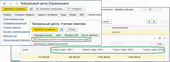 Также появились колонки для новой прогрессивной шкалы основной налоговой базы в документах начисления зарплаты. Изначально они скрыты от пользователя, но как только доход превысит 2,4 млн. в 2025 году, эти колонки в документах появятся.